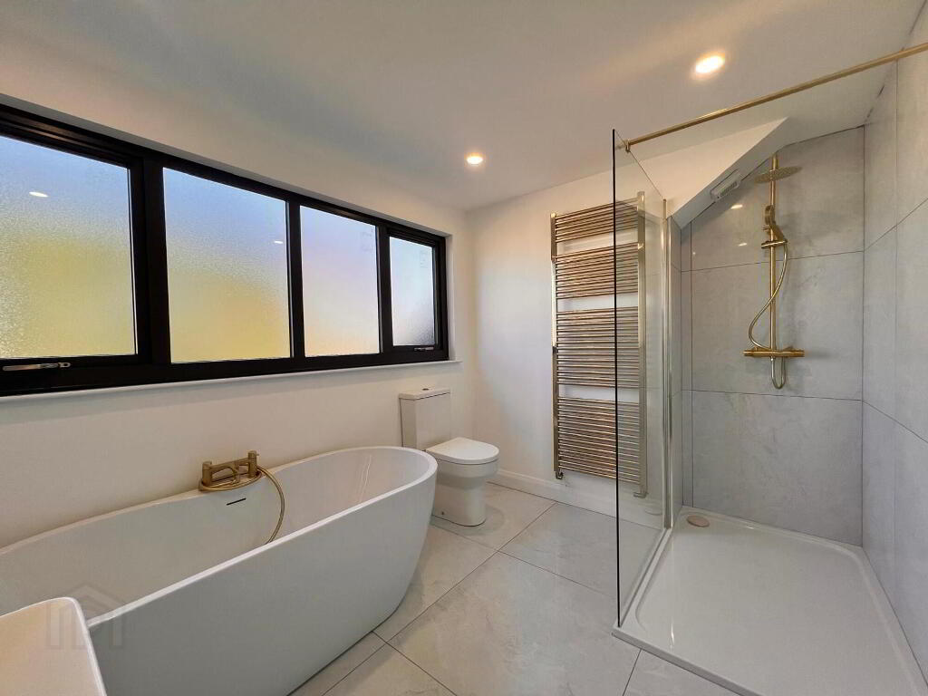 Contemporary four piece suite with brushed brass hardware comprising of wc, wall hung whb & vanity unit, illuminated mirror, free standing bath, shower with rainfall shower head, brushed bath towel rail, walls part tiled, floor fully tiled.