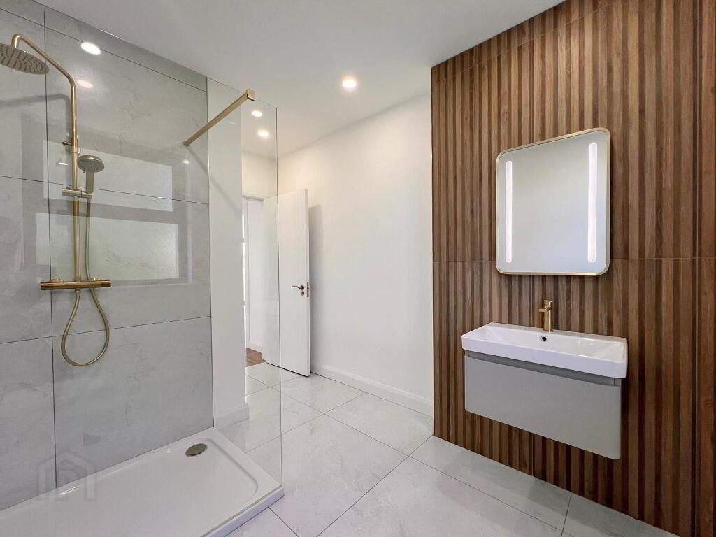 Contemporary three piece suite with brushed brass hardware comprising of wc, wall hung whb & vanity unit, illuminated mirror, shower with rainfall shower head, brushed bath towel rail, walls part tiled, floor fully tiled.