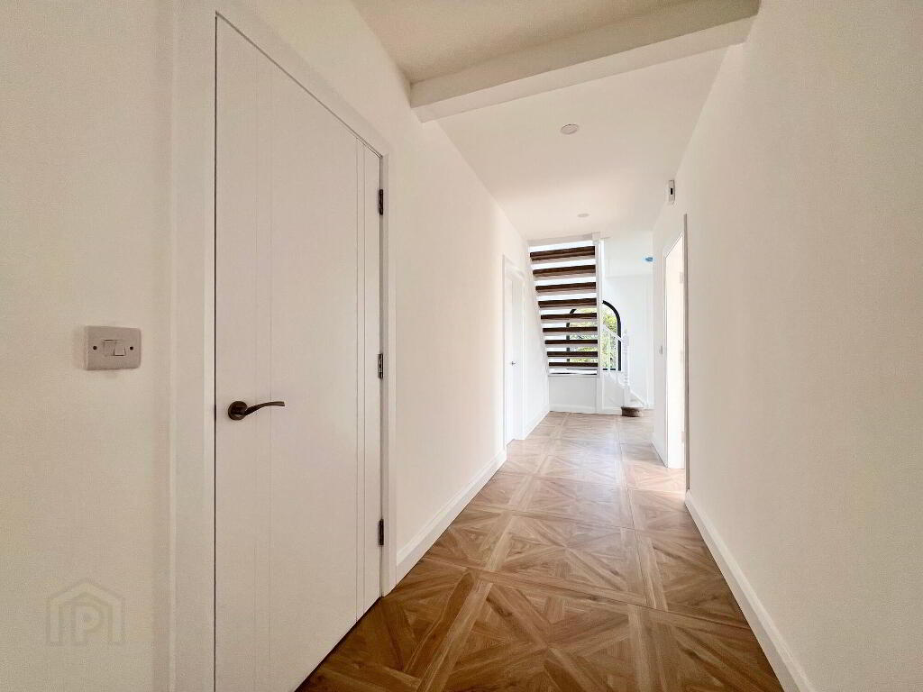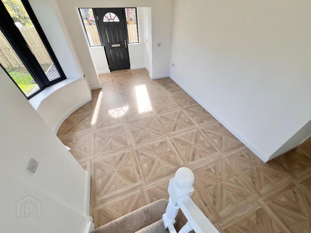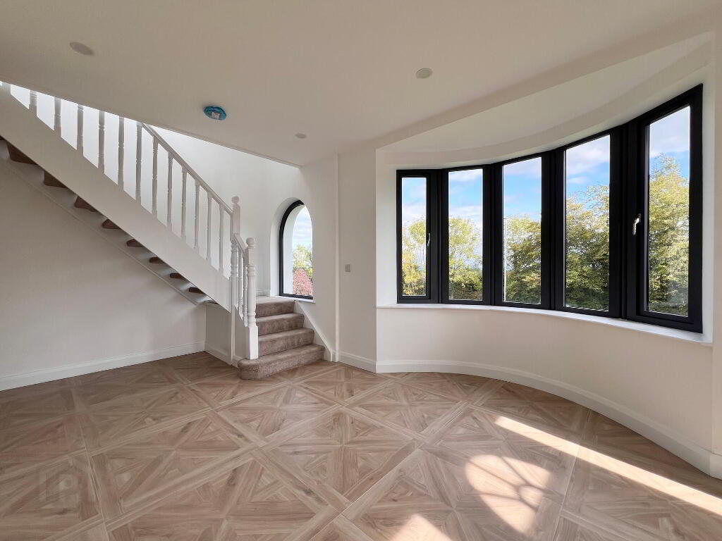 Spacious entrance hall with tiled floor, recessed lights, storage cupboard, bay window.