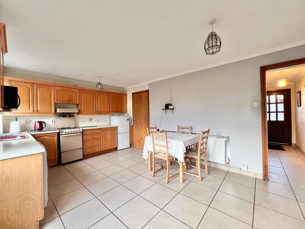 With eye & low level kitchen units, stainless steel sink and drainer unit, extractor fan, plumbed for washing machine, walls part tiled, floor fully tiled, dining area, storage cupboard under stairs.