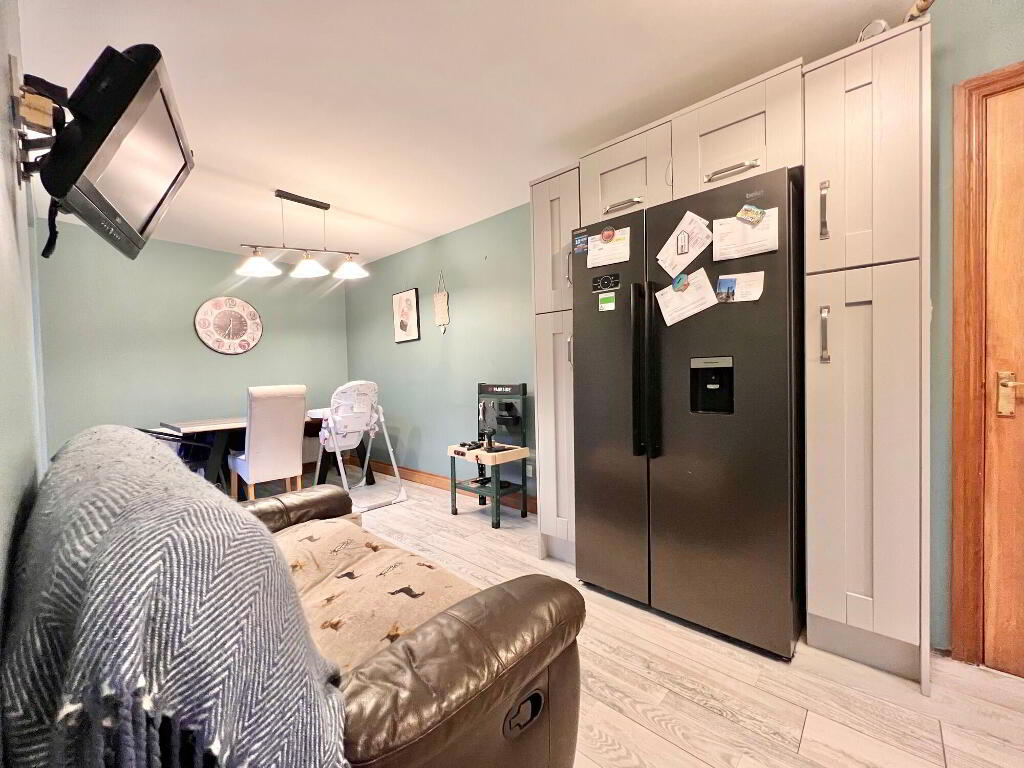 With an excellent range of eye and low level units, sink and drainer unit, electric hob & oven, plumbed for dishwasher, space for American style fridge freezer, tiled floor, dining area, double doors to rear patio paved area.