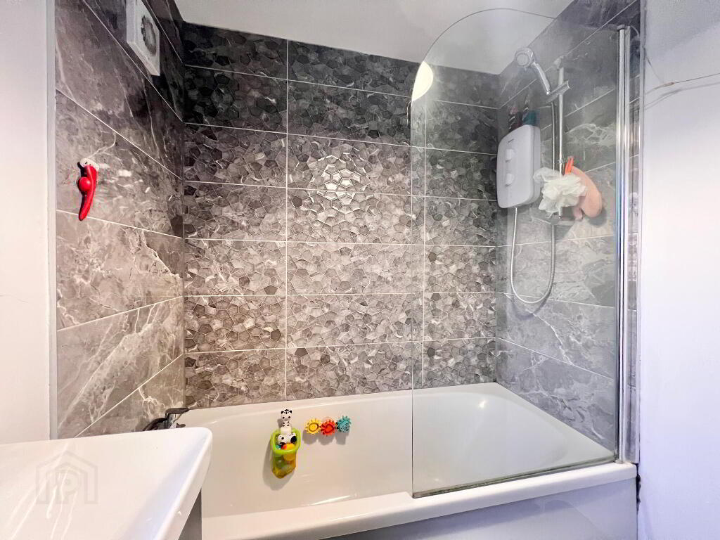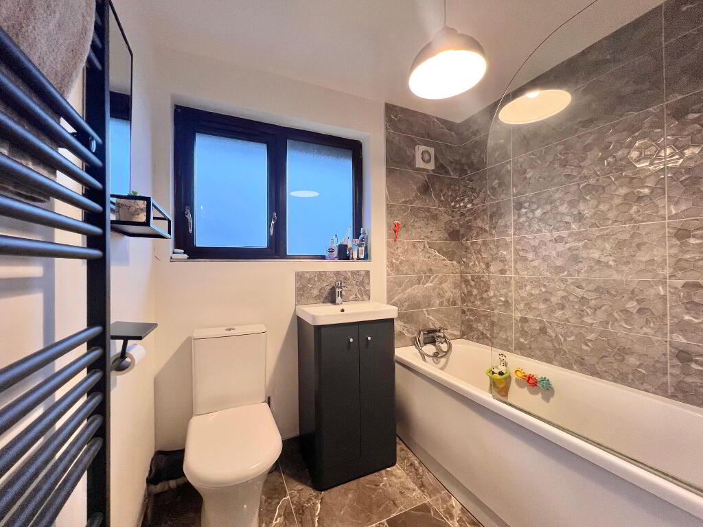 With wc, whb & vanity unit, bath with electric shower over bath, feature towel rail, walls part tiled, floor fully tiled.