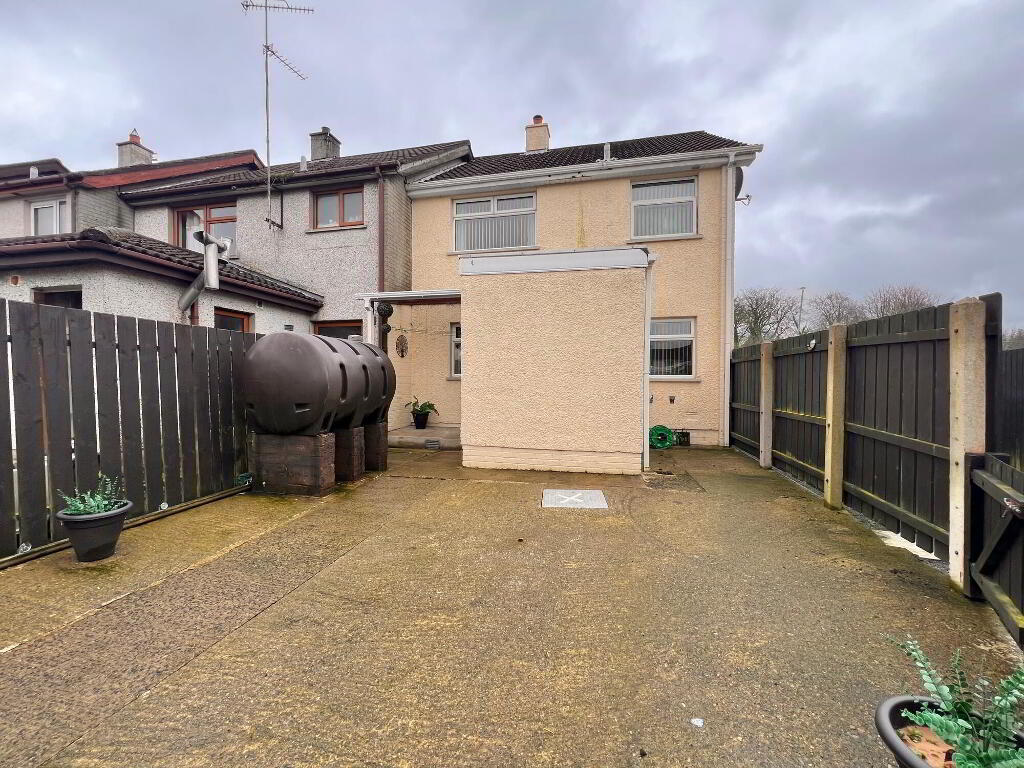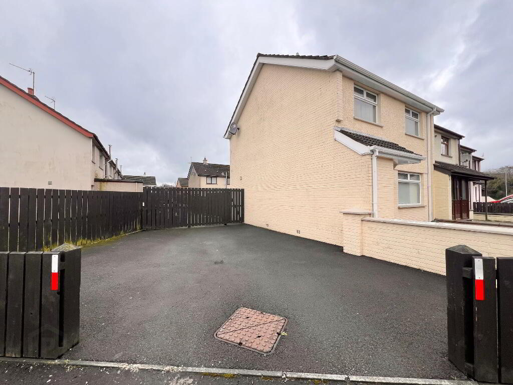 Patio paved area to the front of house, tarmacadem driveway to the side of property with enclosed yard to rear with two no. sheds.