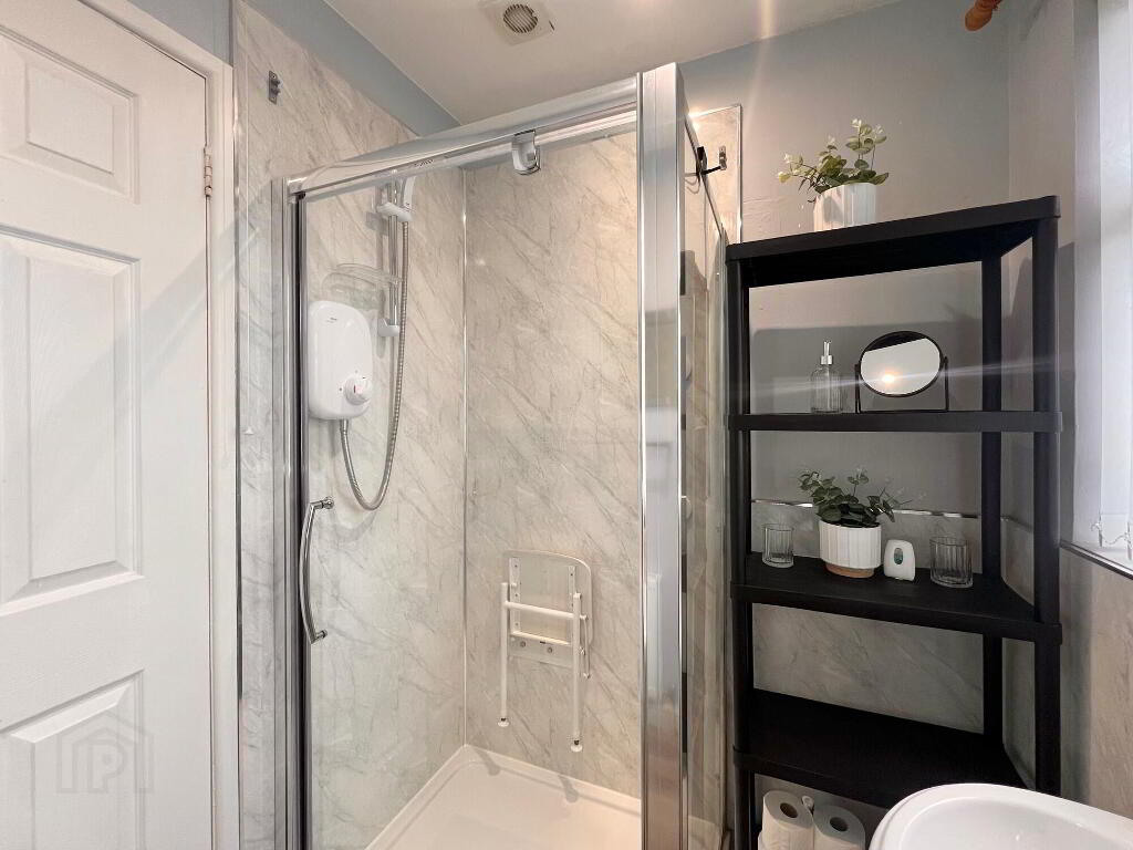 With wc, whb, electric shower, walls part pvc panelled, laminate wood floor