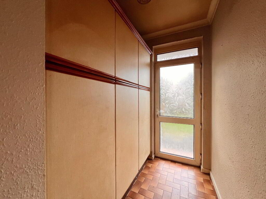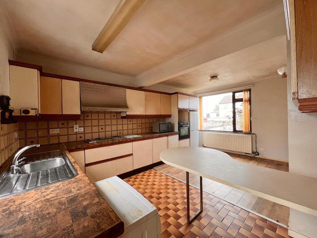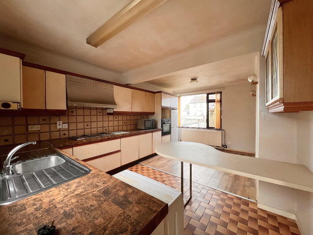 With eye & low level units, breakfast bar area, stainless steel sink and double drainer unit, plumbed for washing machine, walls part tiled, floor part tiled & part laminate wood floor.
