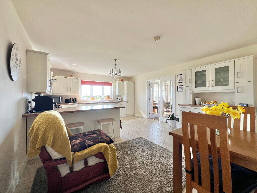With a large selection of eye & low level units with breakfast bar seating area, white ceramic sink with drainer, electric hob and oven, extractor fan, integrated fridge/freezer, integrated dishwasher, tiled floor, dining area, French doors to sunroom.