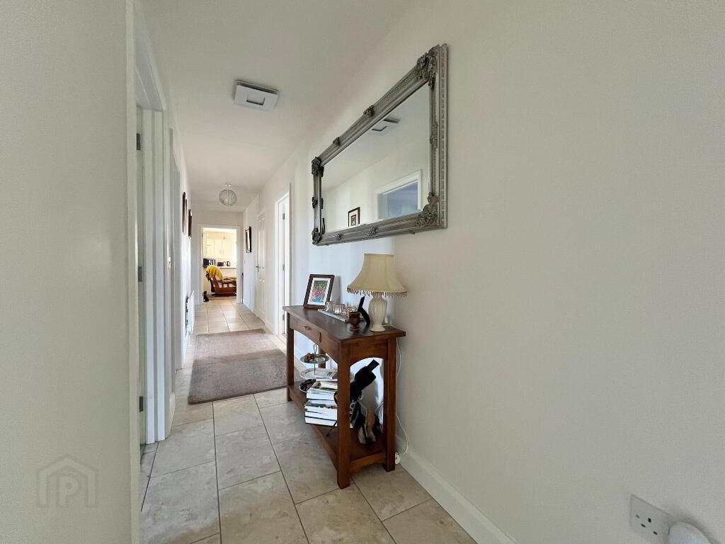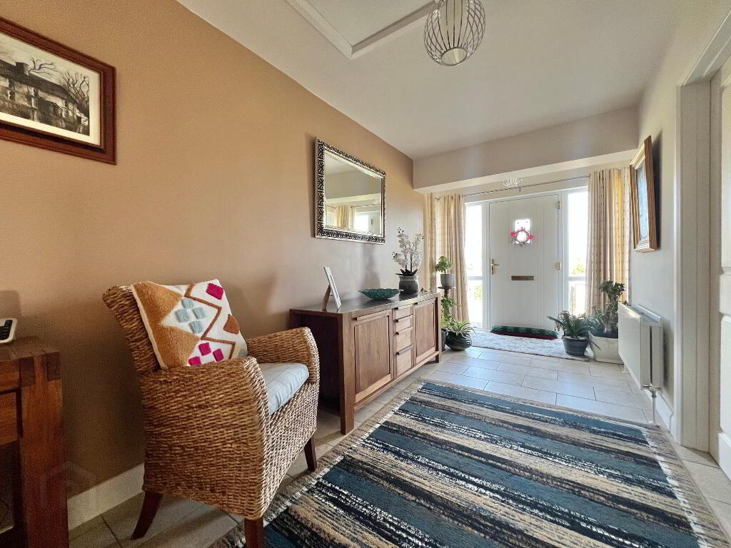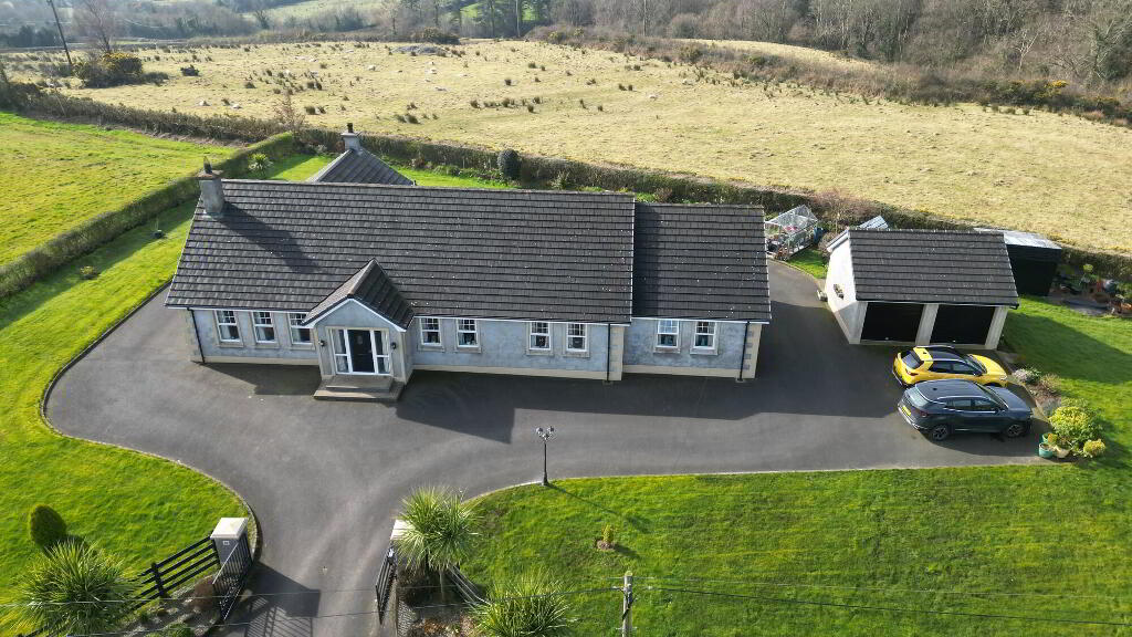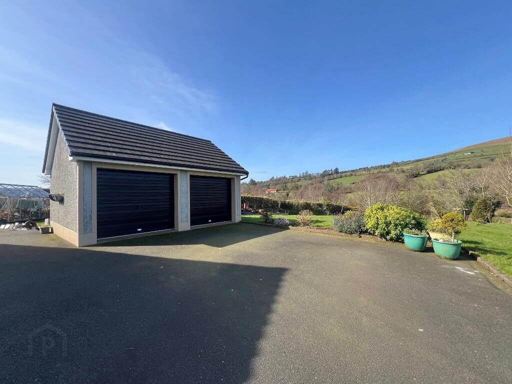 Externally the property has been impeccably finished to include feature entrance pillars with gates, tarmacadem driveway, detached double garage, two additional stores, large open gardens to front side and rear of property with a selection of mature plants and shrubs