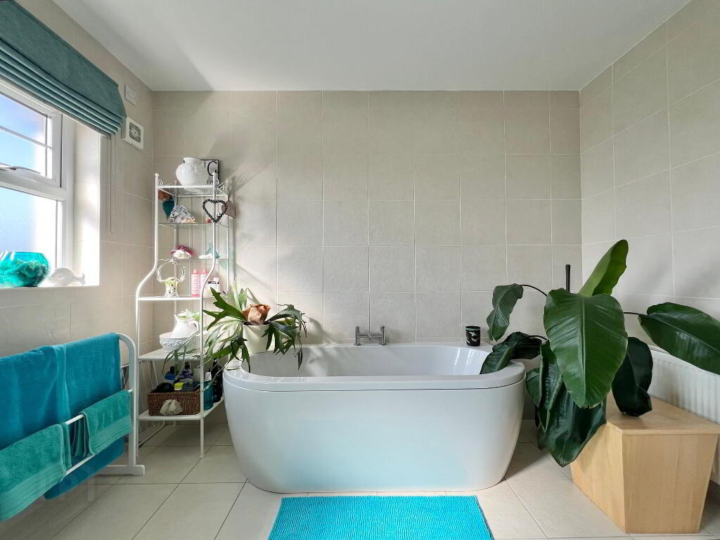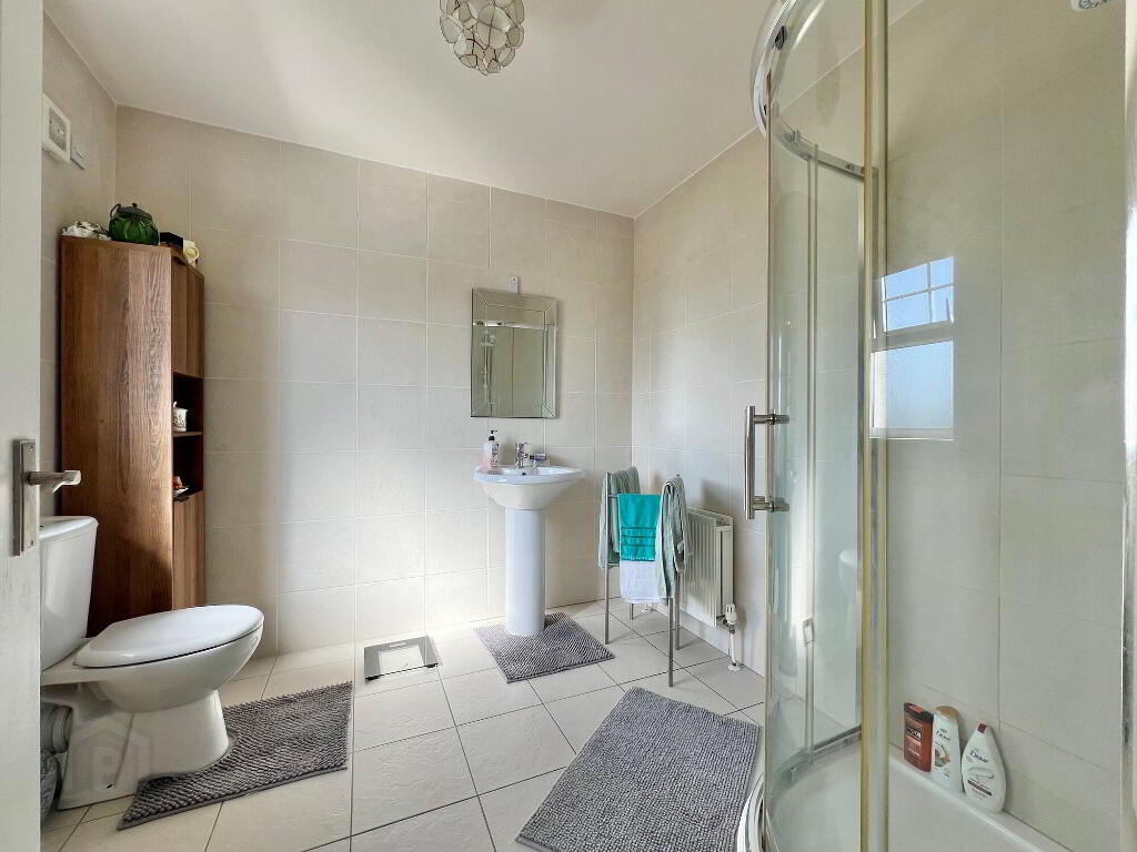Contemporary four piece white suite comprising of wc, whb, bath, corner shower, walls and floor fully tiled.