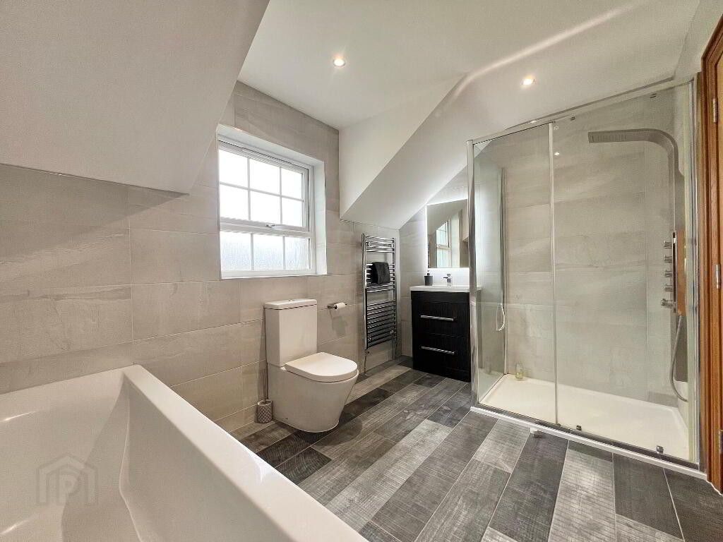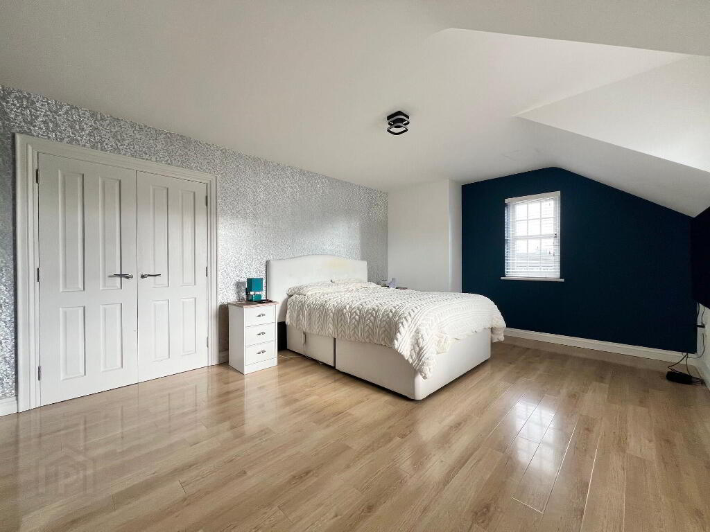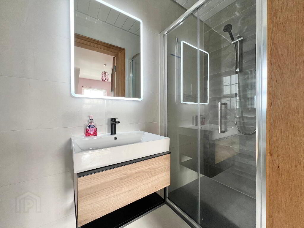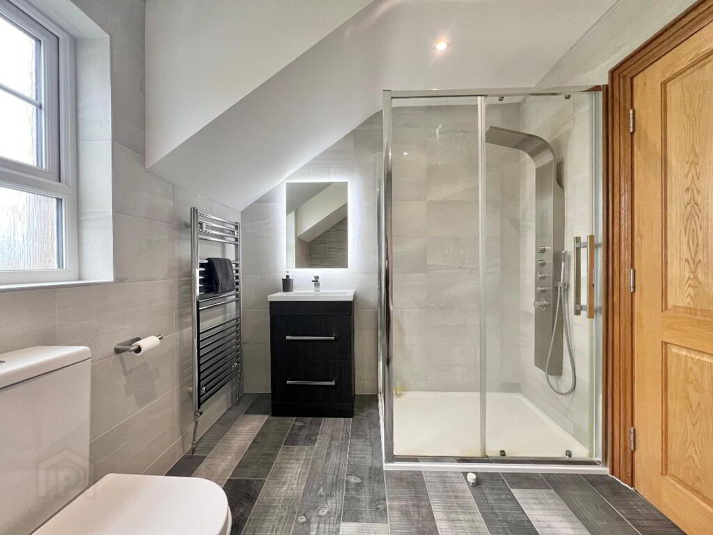 Bedroom One (En-Suite) With laminate wood floor, built in cupboard. En-suite with contemporary three piece white suite comprising of with wc, wall hung whb and vanity unit, illuminated mirror, power shower, walls & floor fully tiled.