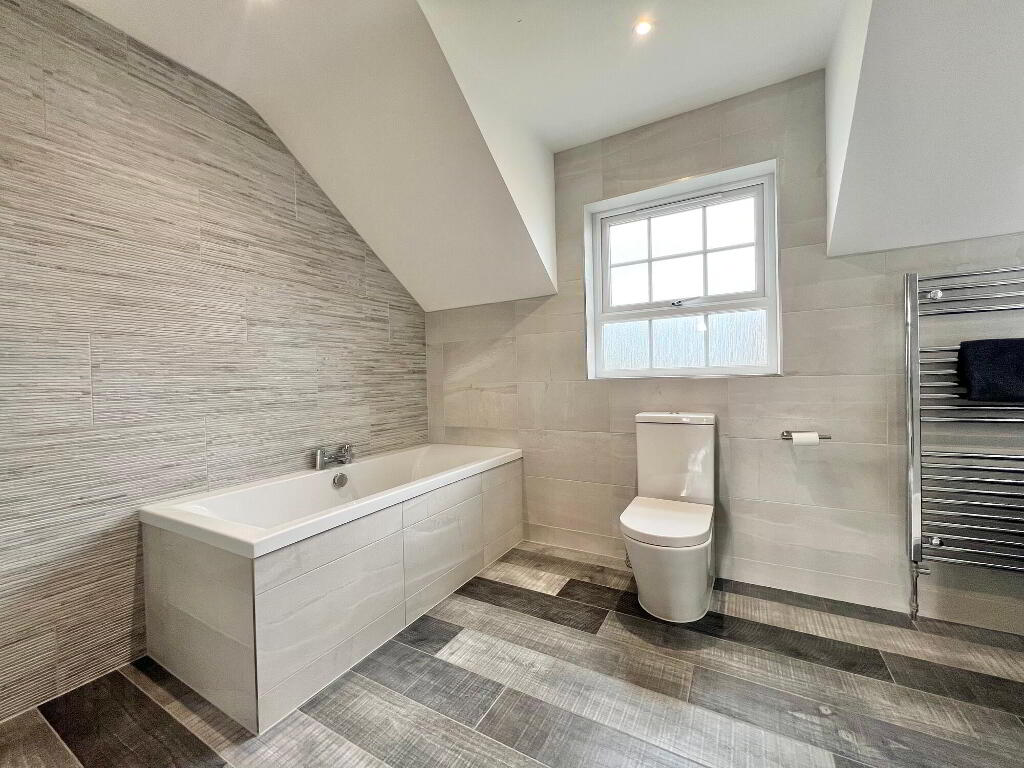 Bathroom Contemporary four piece white suite comprising of wc, whb and vanity unit, illuminated mirror, bath, shower tower with rain and waterfall shower head, walls part tiled, floor fully tiled.