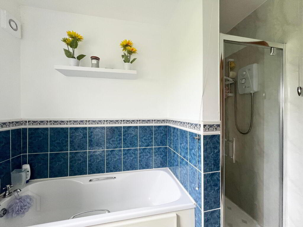 With wc, whb, bath & separate electric shower, walls part tiled.