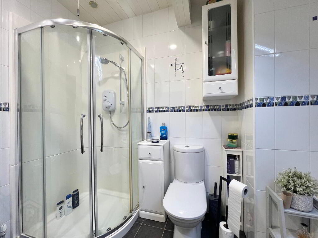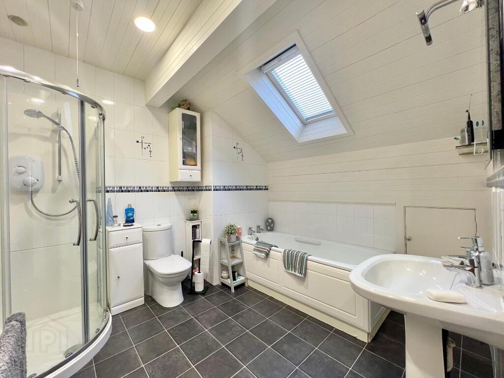 Bathroom With a four-piece white suite comprising of wc, whb, bath, corner electric shower, velux window, walls part tiled, floor fully tiled.