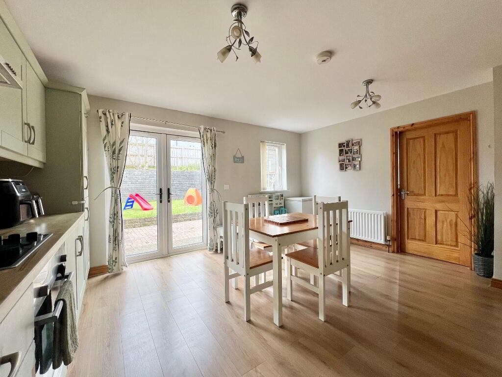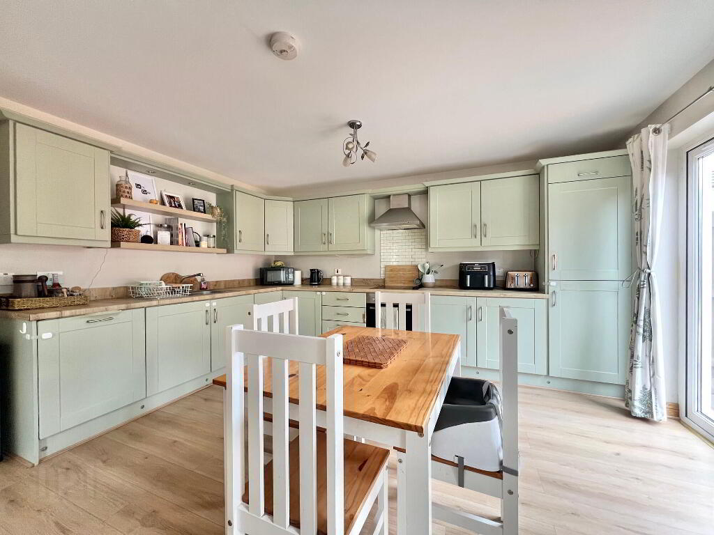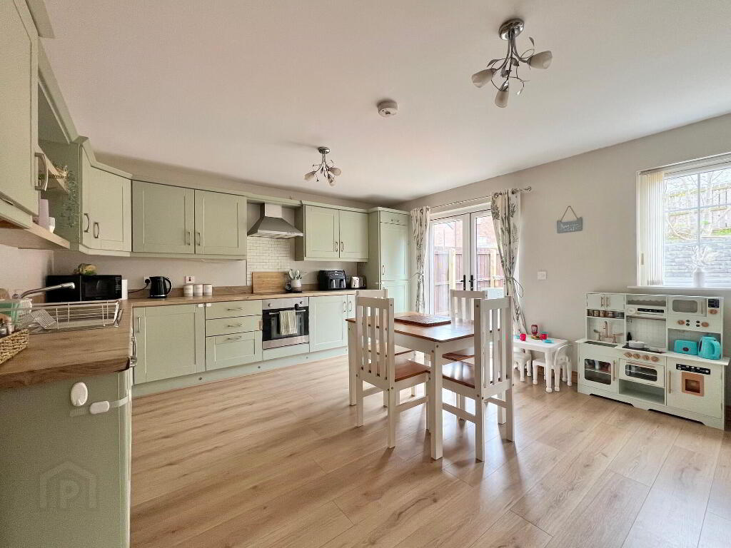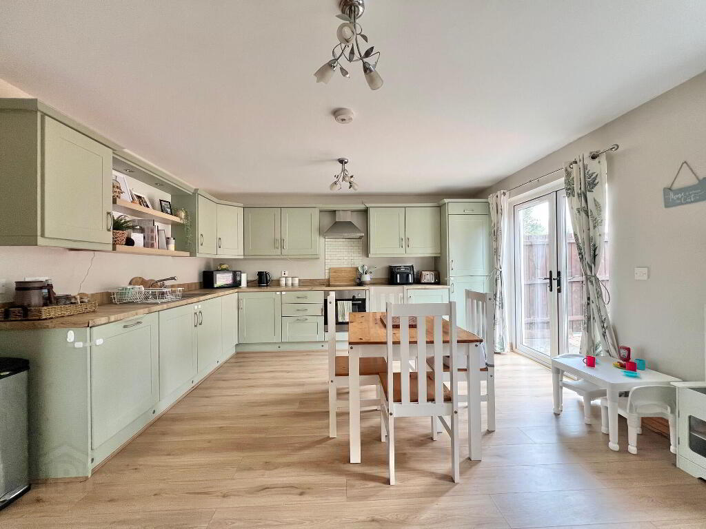 With a good range of eye and low level units, stainless steel sink and drainer unit, electric hob and oven, extractor fan, integrated dishwasher, integrated fridge/freezer, dining area, laminate wood floor, patio doors to rear garden.
