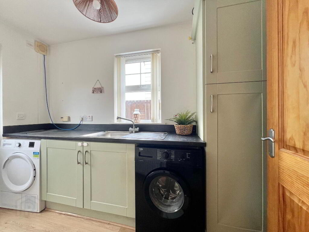 With a range of low level units, stainless steel sink and drainer unit, plumbed for washing machine, space for tumble dryer, laminate wood floor.