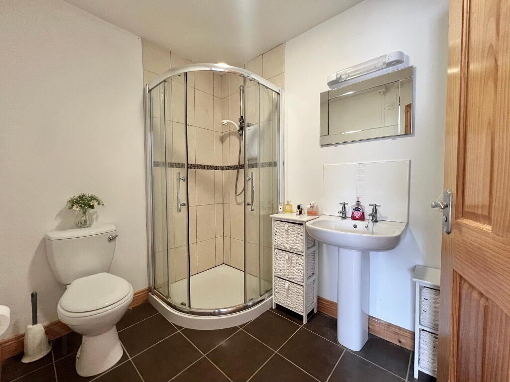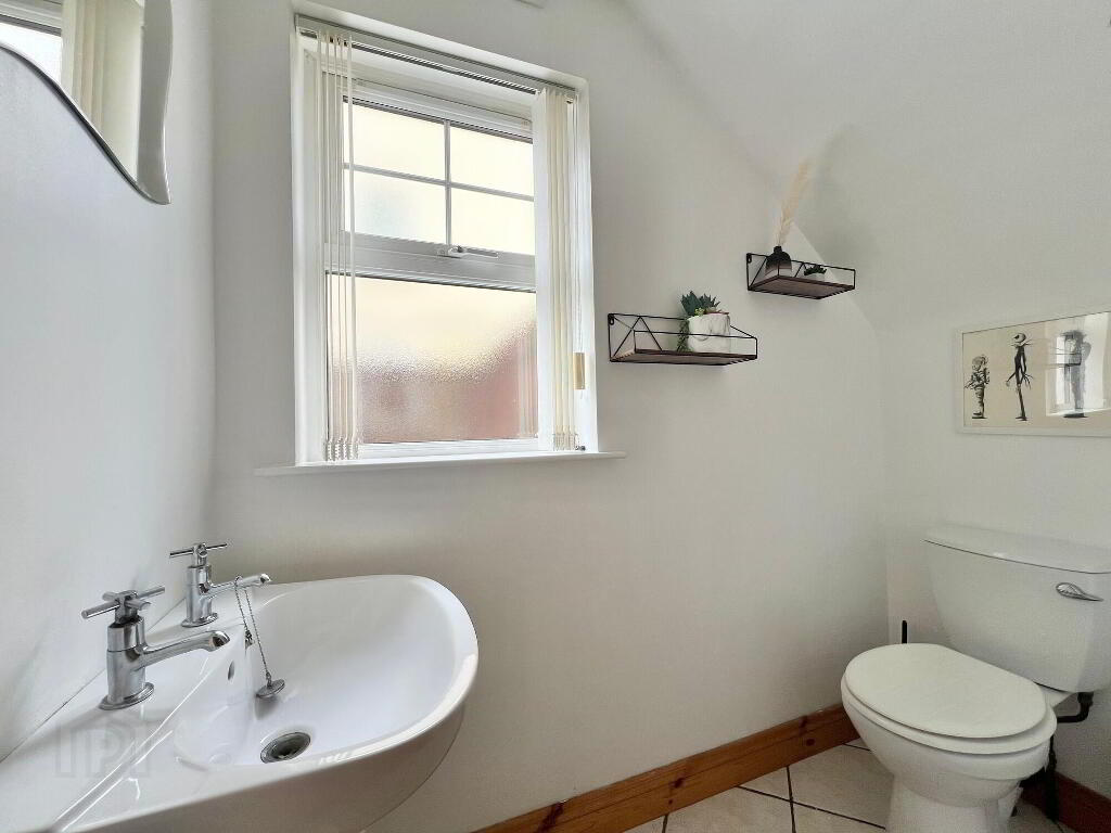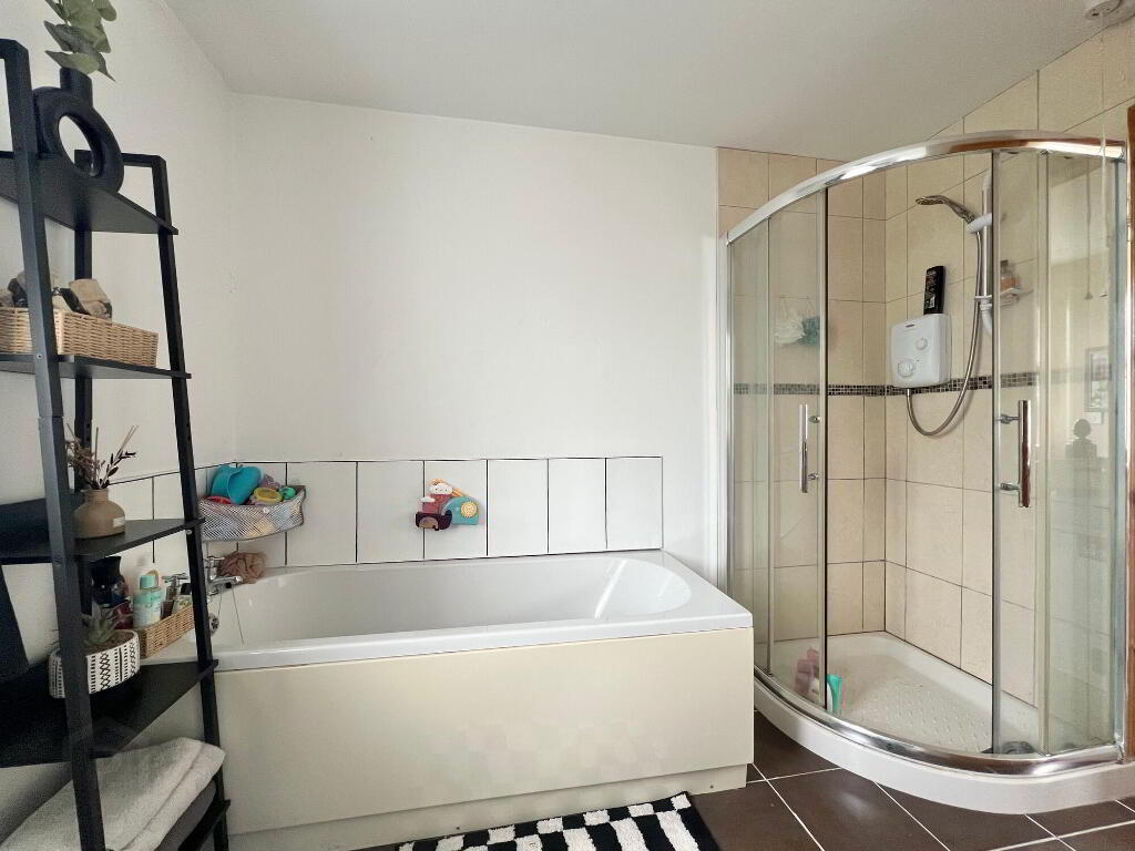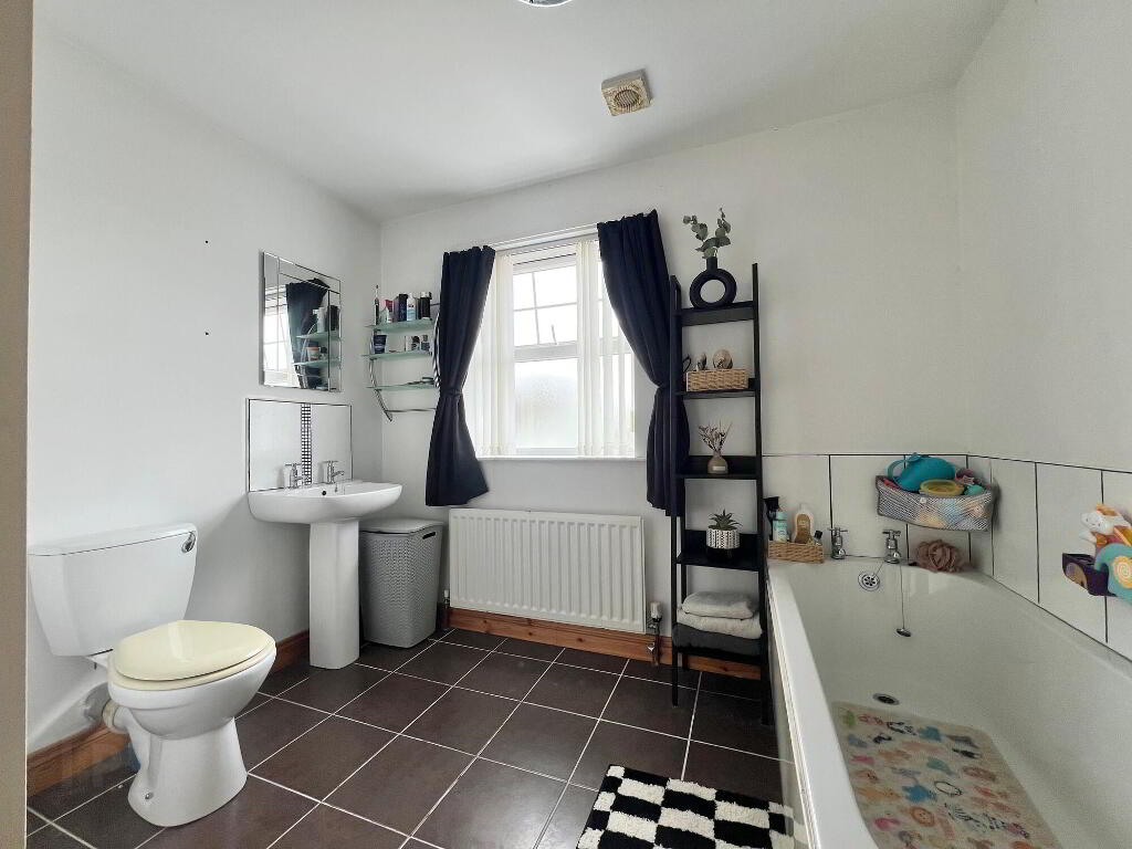 With wc, whb, bath, electric shower, walls part tiled, floor fully tiled.
