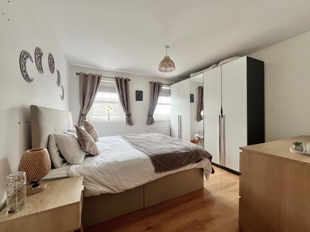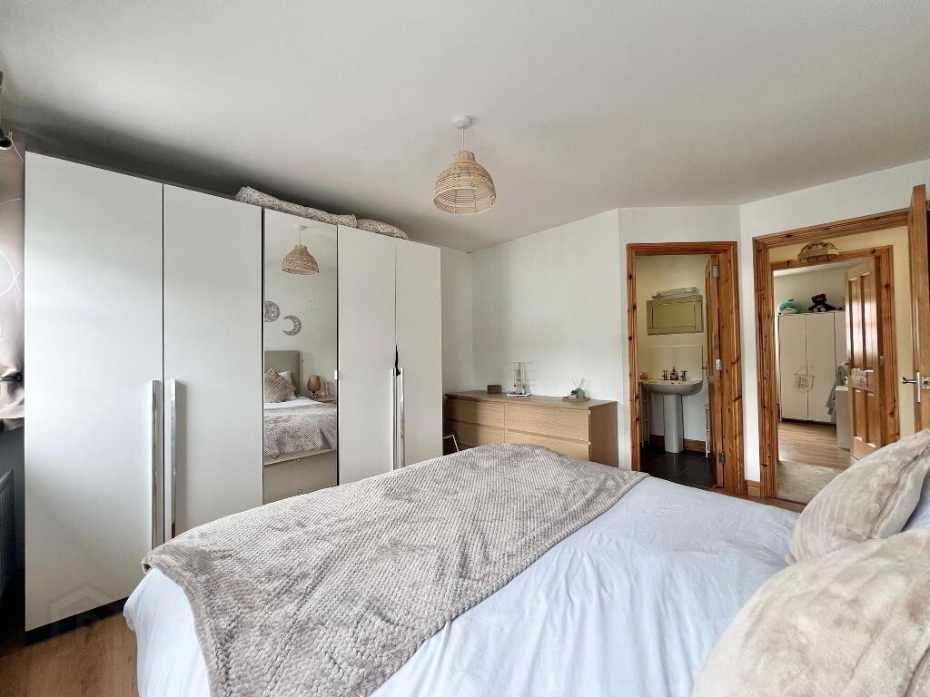With laminate wood floor. En-suite with wc, whb, corner electric shower, walls part tiled, floor fully tiled.