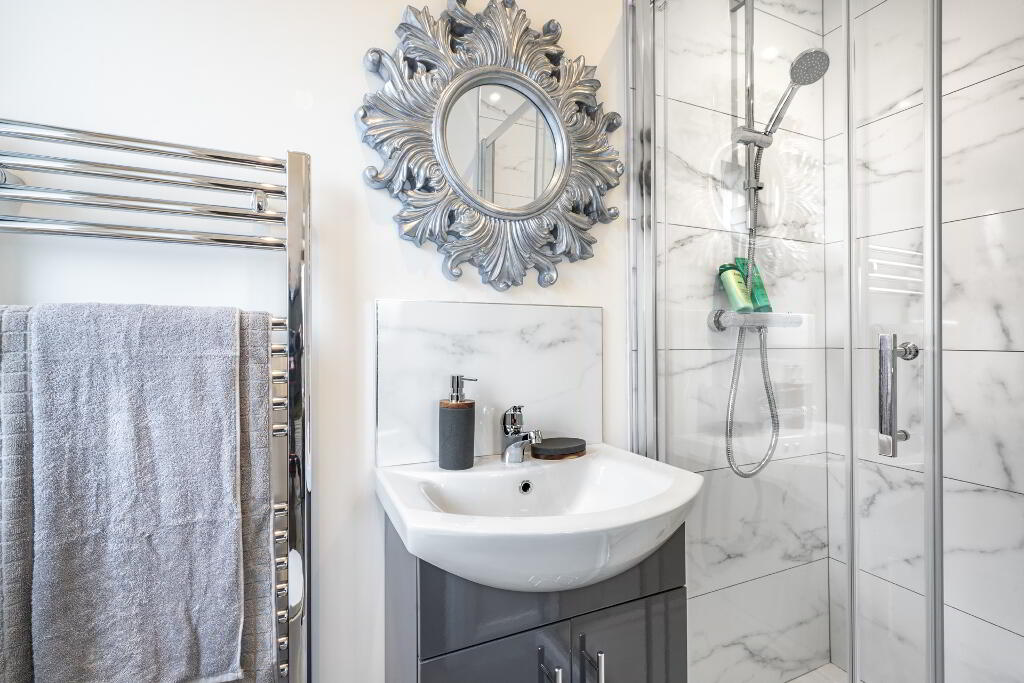 Tiled shower enclosure, with tiled splash back to sinks and baths